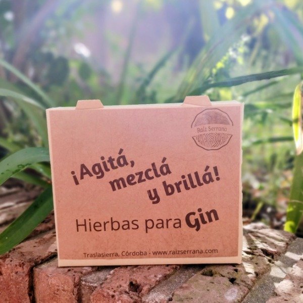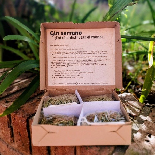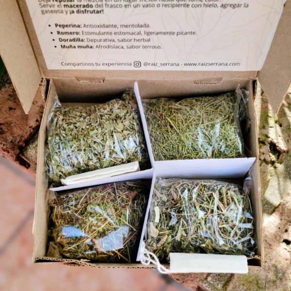 Caja con cuatro yuyos serranos seleccionados para acompañar un buen Gin: Peperina, Romero, Doradilla y Muña muña.