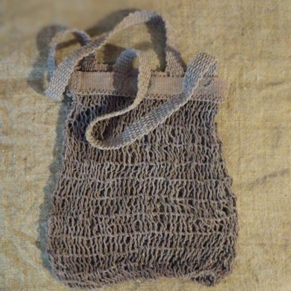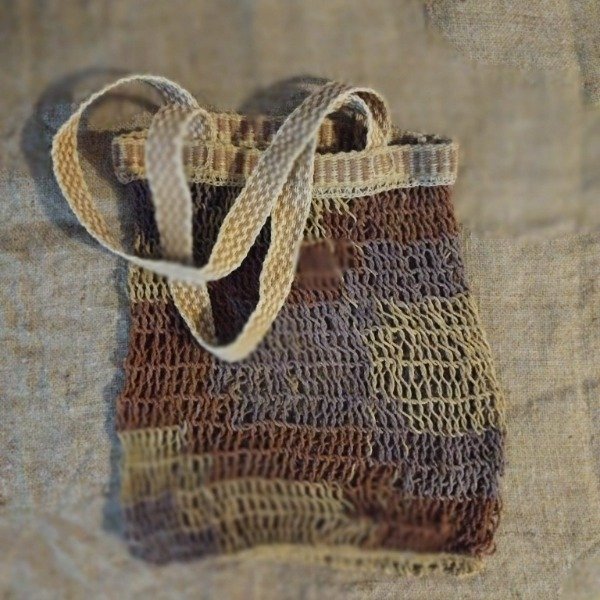 Bolso de chaguar tejido en punto yica con borde superior y tiras tejidas en telar.
